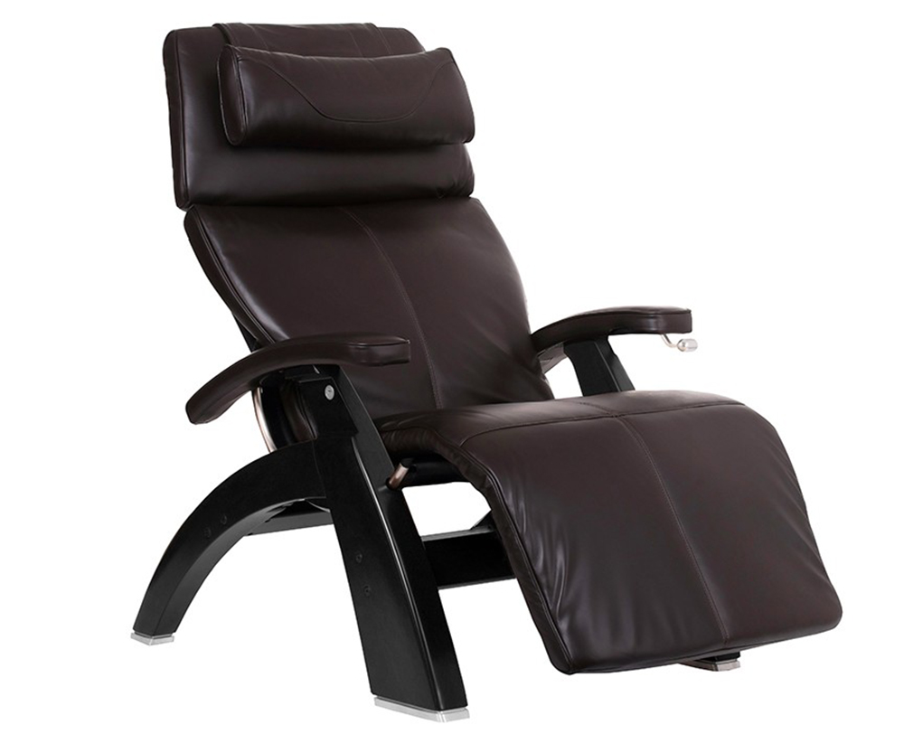 PC-LiVE Espresso Premium Leather Matte Black Wood Base PC-420 Manual Recline Series 2 Perfect Chair Zero Gravity Recliner by Human Touch - Includes a Human Touch 7 Year In-Home Parts and Labor Warranty for New Perfect Chairs. The zero gravity position cradles your back and elevates your legs above your heart, which is the position that doctors recommend as the healthiest way to sit. Easy ingress and egress are achieved with the extended range of motion in the upright position. Exclusive Features Patented Orthonomic™ body frame with built-in lumbar curve. Extra wide legrest provides maximum comfort. The hand carved and finished base is pleasing to the eye, and constructed for years of use. The brake control system is easy to use and extremely reliable. Wedge-shaped, adjustable headrest cushion provides comfort for your head and neck. The adjustable headrest feature allows you to customize the optimum angle of comfort to maximize neck support while reading or watching television (Available on NEW and select Refurbished Chairs). Exclusive guide rail system for smooth recline motion and position control. Refurbished Chairs include a manufacturer's 90 Day Parts Limited Warranty*. New Perfect chairs include a manufacturer's 3 year limited warranty*. For a Power Electric Recline Version please see the PC-600 or PC-610 Omni-Motion Perfect Chair