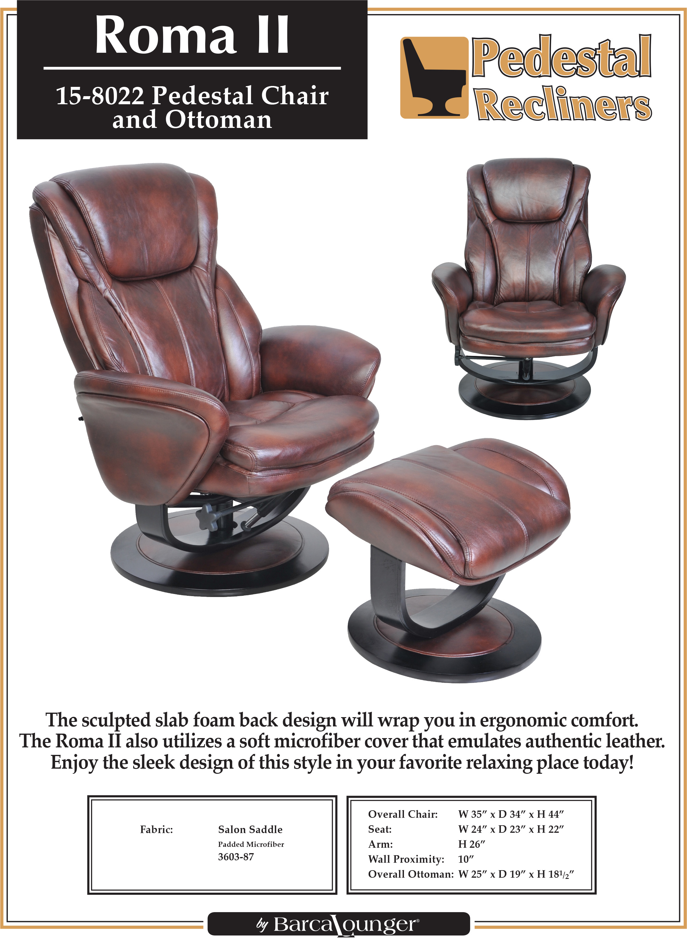 Traditional Recline If you prefer more contemporary seating or do not like the look of traditional recliners, then the Barcalounger Roma II pedestal chair and ottoman might be for you. The design features Salon Saddle Padded Microfiber. Paired with a Regency stain wood base, this chair provides comfortable seating for the modern living space. Features include a 360 degree swivel with multiple recline and lock positions. The matching ottoman contours to the underside of your legs and the back provides excellent lumbar support. Colors: