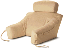 THE BED LOUNGE - The Bed Lounge is personally adjustable. It lets you sit upright in bed superbly supporting each area of your upper body: arms, low back, shoulders, upper back, neck and head. The Bed Lounge's Posture Pillow arches your back slightly inward, like when you are standing. It helps restore the discs of your back to proper alignment so that back strain is minimized. Your head weighs about 12 pounds. Thats equal to a bowling ball! When you are sitting without your head and neck supported those 12 pounds of weight drag and strain on your neck, shoulders and back. The BedLounge's Headrest is designed to be supportive without excessive pressure to the back of your neck and head. Its patented rotational adjustment adapts to whatever task you are doing - reading, computing, watching TV. The Bed Lounge Headrest pillow is there for you, gently cradling your neck and head just where it will do the most good. Overreaching and twisting, or bending in bed can bring on - and aggravate - neck and back problems. It is nearly impossible to get consistent back, neck, arm and shoulder support with pillows. With any arrangement of pillows, the minute you move you start to lose your support system. The BedLounge lets you consistently maintain proper support. Dimensions are 27" wide, 23" arm length and 15" high plus a 5" headrest. Inside side to side dimension is 15". Headrest is 5" by 17".