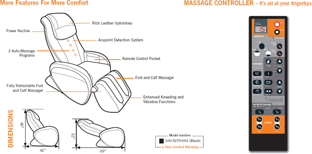 • Rich Leather Like Upholstery: Secured directly to the frame for maximum durability and aesthetics. There are no loose pads or sliding pillows to get in the way of premium massage comfort and performance.