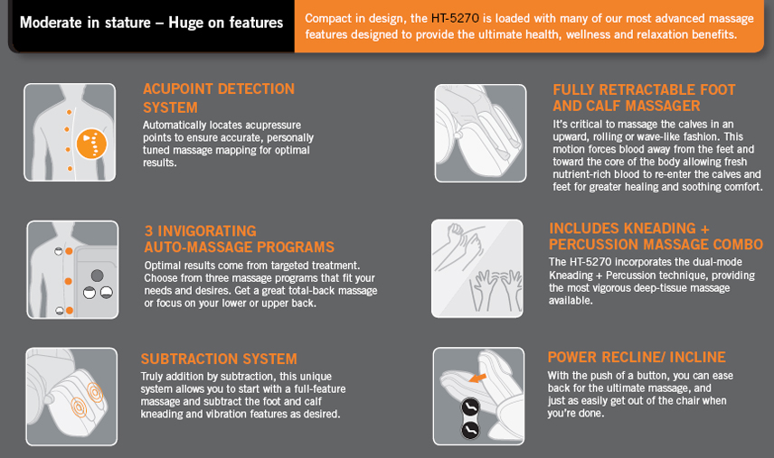 NEW iJoy HT-5270 Human Touch Home Massage Chair / Recliner with Body Scan Technology + Calf and Feet Massager - As one of the sleekest, most compact models we offer, the Human Touch® HT-5270 Robotic Massage® chair is the perfect fi t for any space, and the perfect blend of form and function. The HT-5270 is suited particularly for a person with a moderate frame of 5’ 10” or less who is looking for a rejuvenating and invigorating massage experience. It’s loaded with features commonly found in chairs twice its price, delivering an invigorating head-to-toe massage that helps alleviate stress, tension, back pain and sore muscles. Lean back in the comfortable leather-match upholstery, choose one of three auto massage programs, and discover how the HT-5270’s Acupoint Body Scan Detection sensors automatically locate your acupressure points to effectively target the massage to your back. The three auto massage programs, as well as the four individual massage modes replicate the techniques used by expert back and spinal care professionals. Which means a truly professional massage at your convenience in the comfort of your own home. Human Touch® is proud to offer a unique retractable foot and calf massager that stows hidden away when not in use. The patented Human Touch Massage System aids in improving blood circulation in the calves and feet. Kneading the calves in an upward motion relaxes tension in the muscles and improves blood circulation, soothing away foot and calf pain in minutes. The HT-5270 is expertly tailored to your body, your mood, and your lifestyle. Its sleek design and advanced engineering work together to enhance your overall well-being, leaving you feeling relaxed and refreshed.
