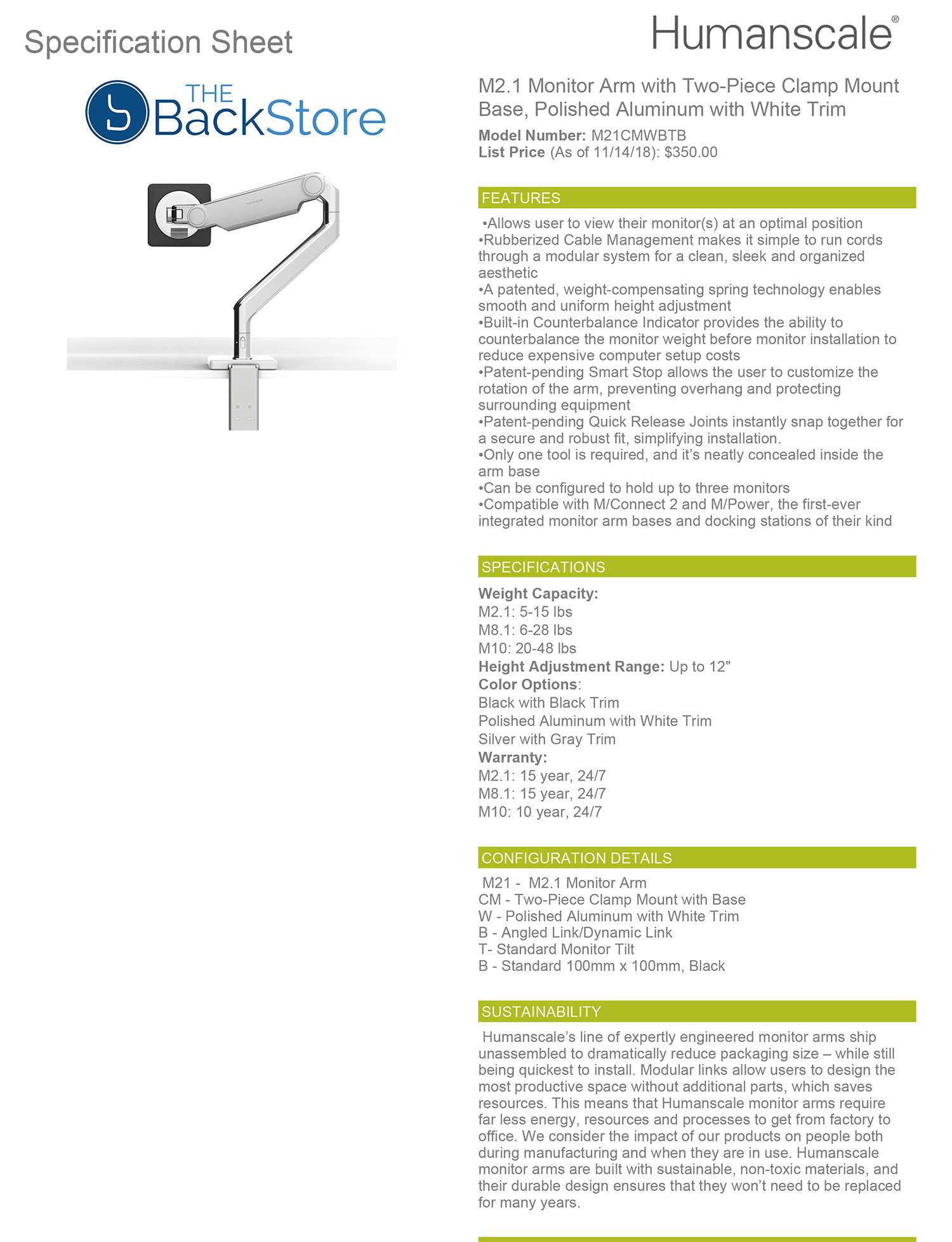 About Humanscale M2 Monitor Arm: The M2 embodies what a monitor arm should be. The M2 allows the user to work in a healthy posture by setting the monitor at an optimal distance and height, collaborate easier through effortless screen sharing, and increase desk space. Its cable management and minimal design enhance the look of any workstation.