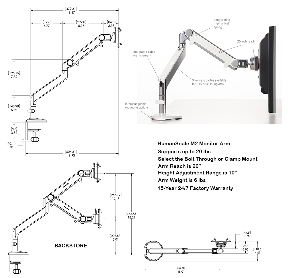 M2 Movement: With fewer moving parts than other articulating monitor arms, no gas cylinder, and steel and aluminum construction allows the M2 to have an ultra thin profile while extending its useful life to many times that of traditional gas spring monitor arms. As a result, every M2 monitor arm is backed by Humanscale’s robust 15-year 24/7 warranty.