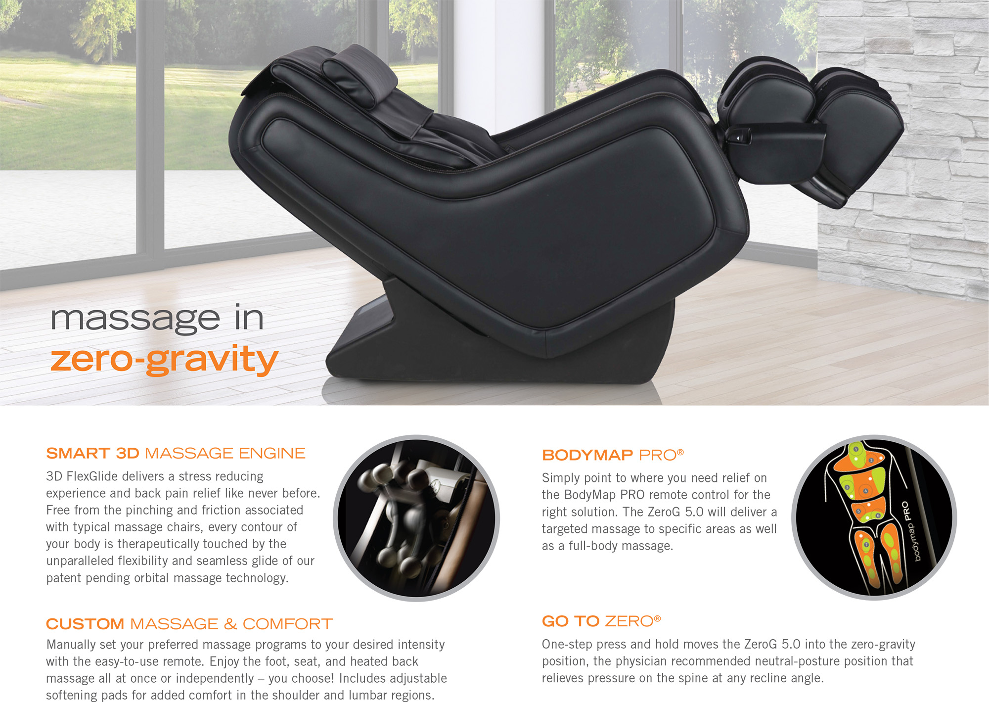 • BodyMap PRO - Simply point to where you need relief on the BodyMap PRO remote control for the right solution. The ZeroG 5.0 will deliver a targeted massage to specific areas as well as a full-body massage.