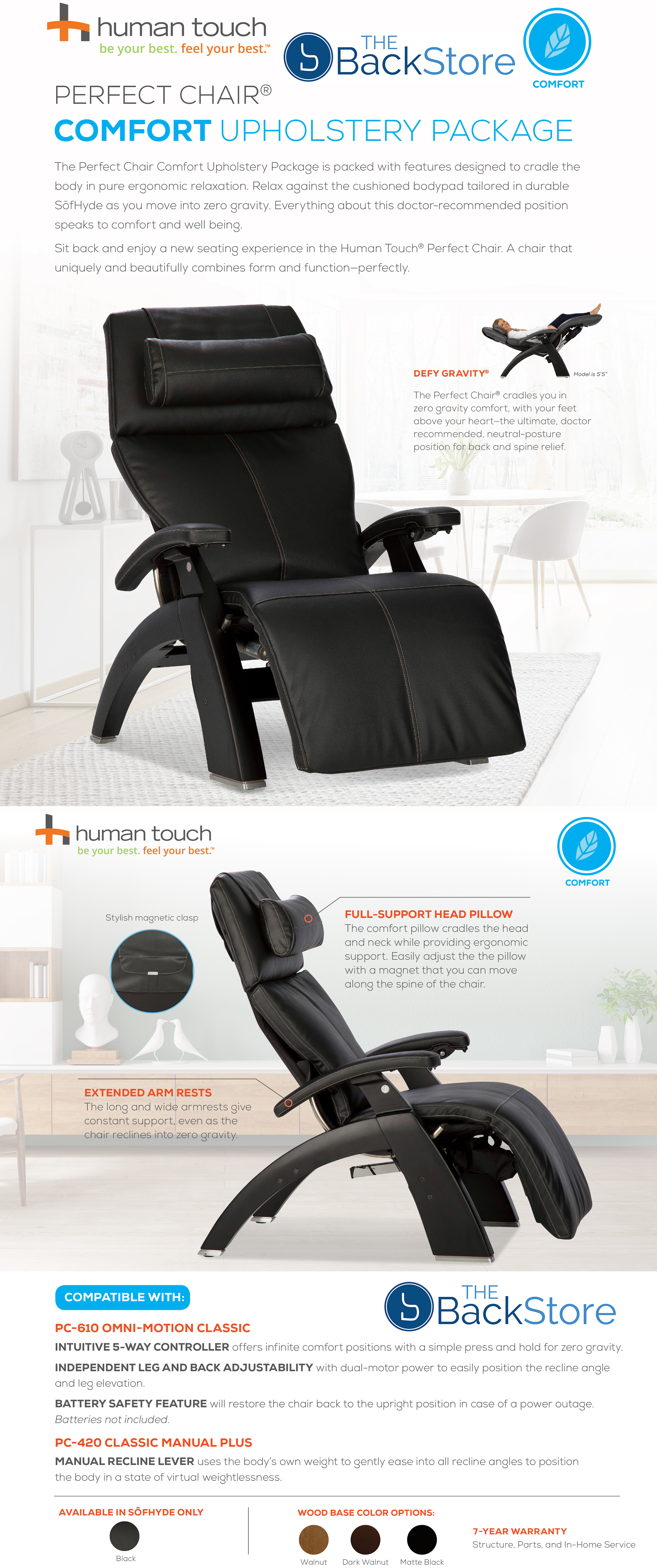 NEW Human Touch Perfect Zero Gravity Recliner Chair with the Comfort Upholstery Package - New Updated head pillow with magnetic clasp. Black Softhyde Vinyl only for the PC-420 and PC-610 Perfect Chairs only. The zero gravity position cradles your back and elevates your legs above your heart, which is the position that doctors recommend as the healthiest way to sit. Easy ingress and egress are achieved with the extended range of motion in the upright position. Exclusive Features Patented Orthonomic™ body frame with built-in lumbar curve. Extra wide legrest provides maximum comfort. The hand carved and finished base is pleasing to the eye, and constructed for years of use. The brake control system is easy to use and extremely reliable. Wedge-shaped, adjustable headrest cushion provides comfort for your head and neck. The adjustable headrest feature allows you to customize the optimum angle of comfort to maximize neck support while reading or watching television (Available on NEW and select Refurbished Chairs). Exclusive guide rail system for smooth recline motion and position control.
