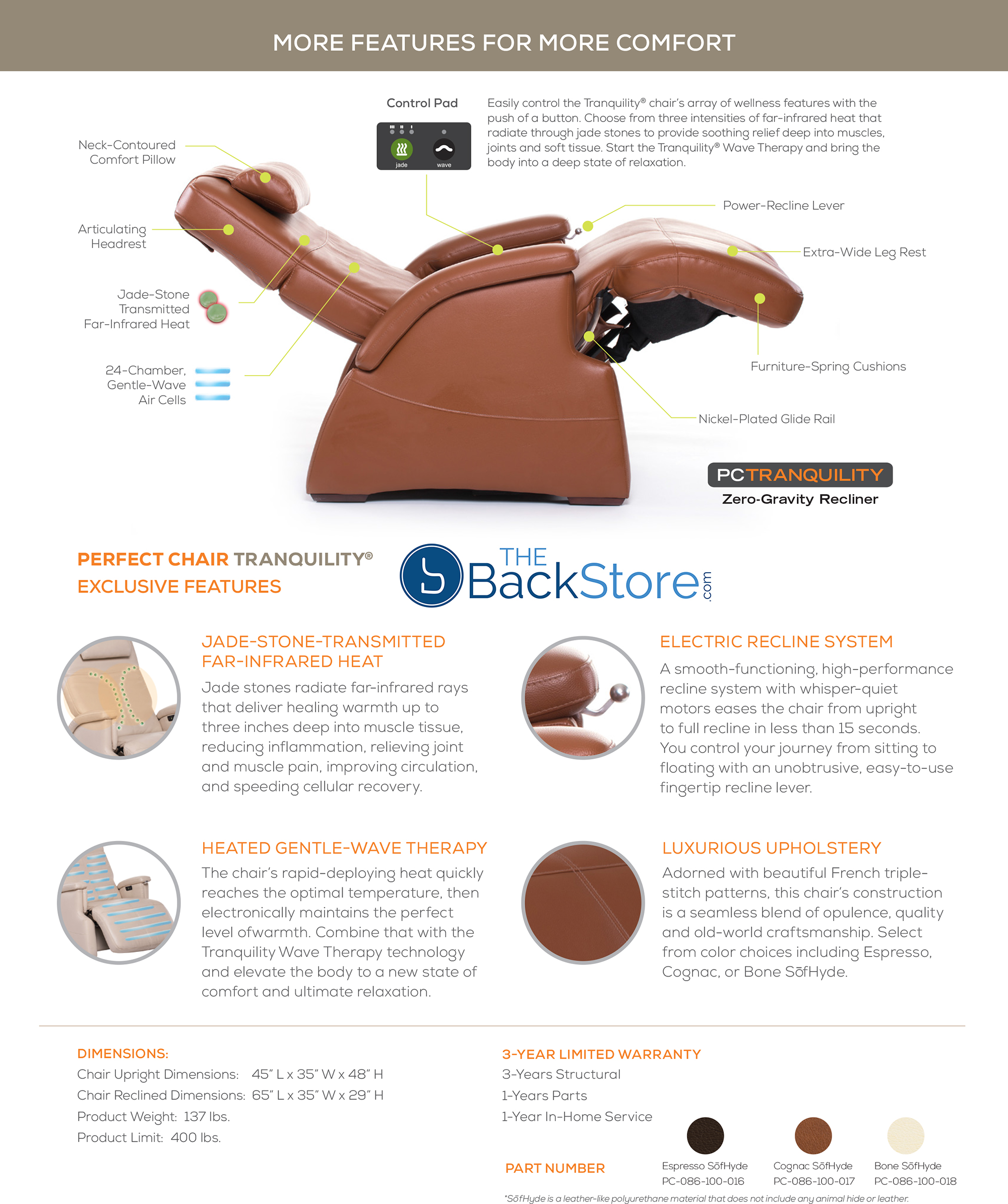 The Zero Gravity Neutral Position cradles your back and elevates your legs above your heart. Easy ingress and egress are achieved with the extended range of motion in the upright position. Jade Heat is a Stone-Transmitted Heated Gentle-Wave Far-Infrared Therapy. Extra wide legrest provides maximum comfort. Luxurious SoftHyde Vinyl Easy Clean Upholstery. The adjustable headrest feature allows you to customize the optimum angle of comfort to maximize neck support while reading or watching television. Exclusive guide rail system for smooth recline motion and position control. Upright Dims 45"L X 35"W X 48"H, Reclined Dims 65"L X 35"W Reclined Headrest Height 27", Reclined Footrest Height 29", Seat Width 23" Gross weight (in box) 155 lbs, Maximum Load Weight 400 lbs Required Recline Clearance is 12" 3-Year Warranty - 3Yr Structural, One Year In-Home Parts & Labor Box Dims 56"L X 36"W X 46"H