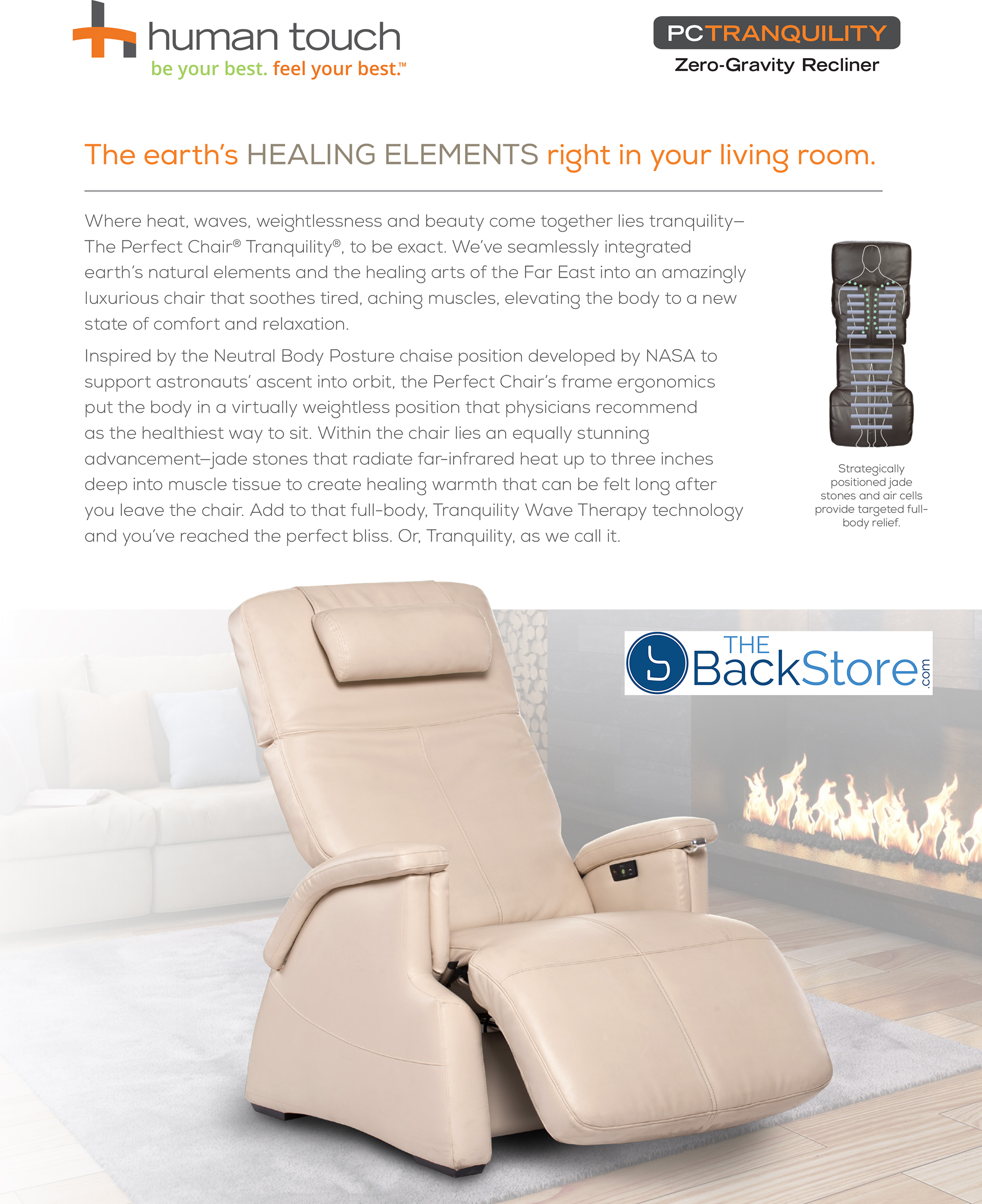 Human Touch Perfect Chair PC-086 Tranquility Power Zero-Gravity Recliner with Jade Heat and Air Massage - We've seamlessly integrated Earth’s natural elements and the healing arts of the Far East into an amazingly luxurious chair that soothes tired, aching muscles, elevating the body to a new state of comfort and relaxation. Inspired by the Neutral Body Posture position developed by NASA to support astronauts’ ascent into orbit, the Perfect Chair’s frame ergonomics put the body in a virtually weightless position that physicians recommend as the healthiest way to sit. Within the chair lies an equally stunning advancement: jade stones that radiate farinfrared heat up to three inches deep into muscle tissue to create healing warmth that can be felt long after you leave the chair. Add to that full-body, Tranquility Wave Therapy technology and you’ve reached the perfect bliss. Tranquility, as we call it. Power Electric Recline System.